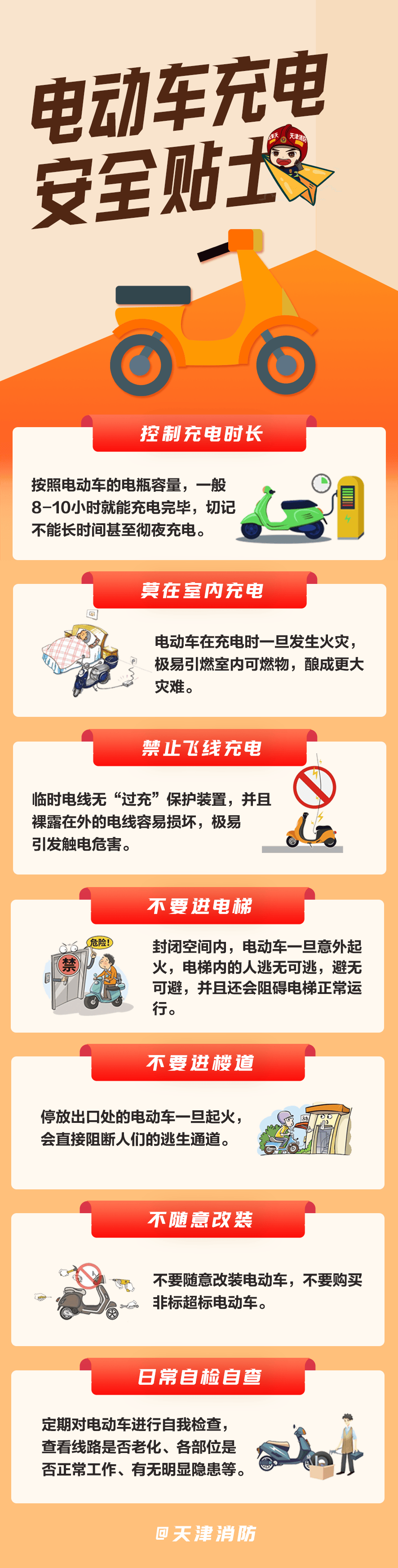 别把电动车推进电梯、拖进楼道,更别在室内给它“喂夜草”;电池禁拆改,飞线=火线;室外集中充,停车离杂物,通道常畅通;闻到焦糊味先断电,小火快逃勿回头,全家牢记消防口诀,平安才能一路随行。
