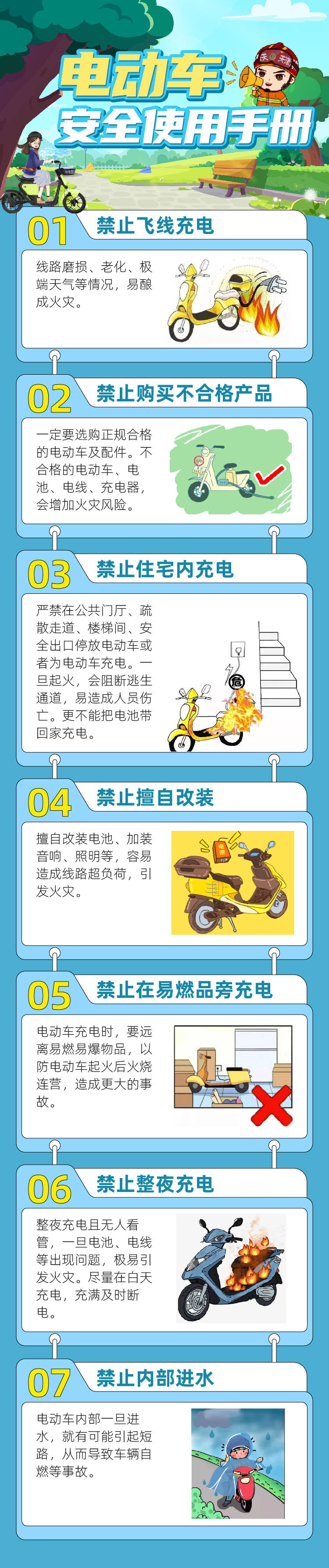 别让电动车变“火”车:绝不进楼入户,电池不改装、电线不飞甩,选室外智能桩、限时充满自断,停车离墙半米、通道永远空出来,闻到焦糊先断电,小火快逃勿乘梯,全家牢记把命守,平安才是回家路。