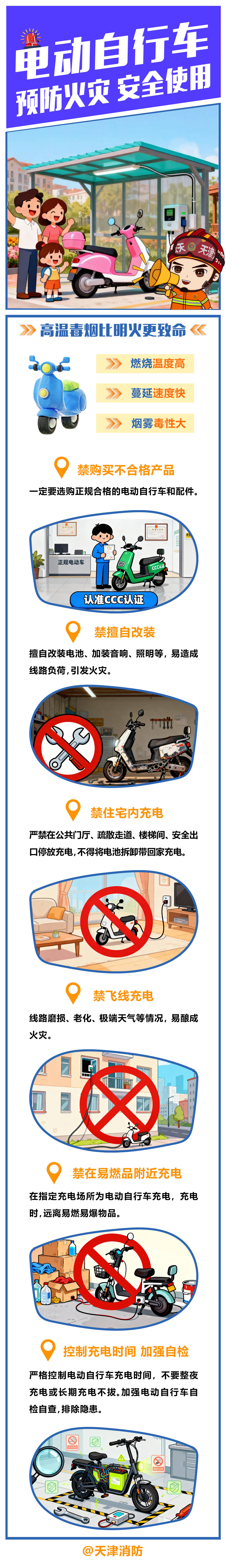 别让电动车变“点火器”!进楼入户充电隐患大,千万别飞线,室外集中充更安全。充电有人看、不过夜,电池老化别改装。停车远离杂物,留出生命通道。火起冒烟快逃生,别贪物、走楼梯,安全才是家人的牵挂!
