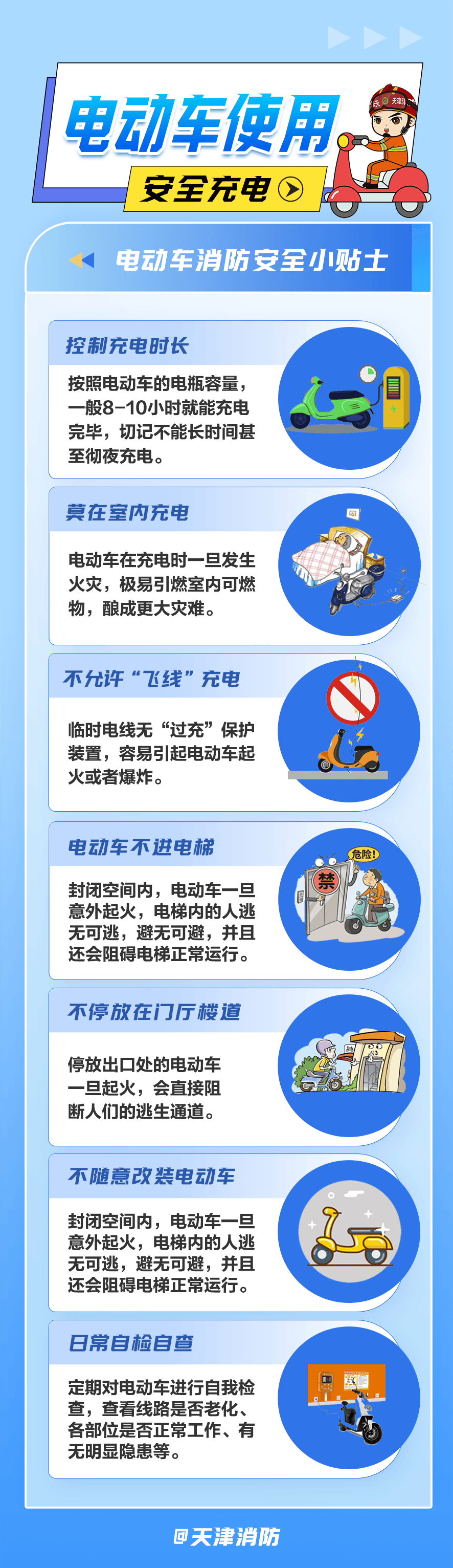 别让电动车变“火”车:绝不进楼入户,电池不改装、线路不飞线,选室外智能桩、定时充、有人守,停车远离杂物、留出生命通道;闻到焦糊味先断电,小火快逃勿乘梯,全家牢记消防嘱托,平安一路随行!