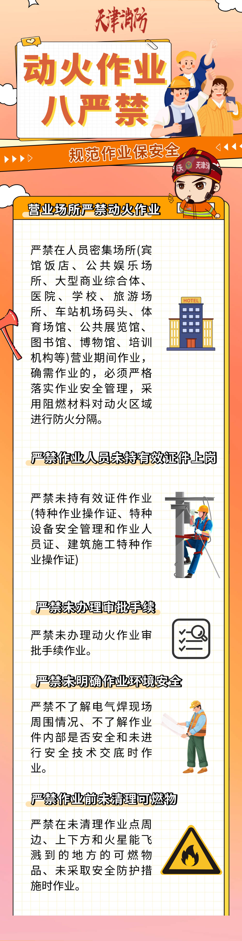 “动火作业,安全为先:先审批,持证上岗,清理可燃物,备好灭火器,专人盯守,火星不落地。作业后复查,守规程护家园,别让火星毁高楼!”