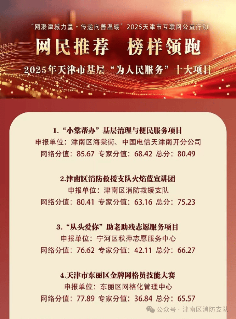 近日,在由天津市委网信办联合市委社会工作部、市委教育工委、市总工会、团市委、市妇联、市残联、市红十字会8部门联合主办的“网聚津城力量·传递向善温暖”2025天津市互联网公益行动中,津南消防支队“火焰蓝宣讲团”成功获评2025年天津市基层“为人民服务”十大项目。